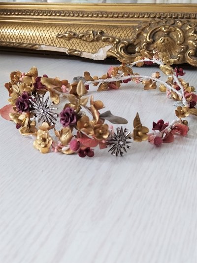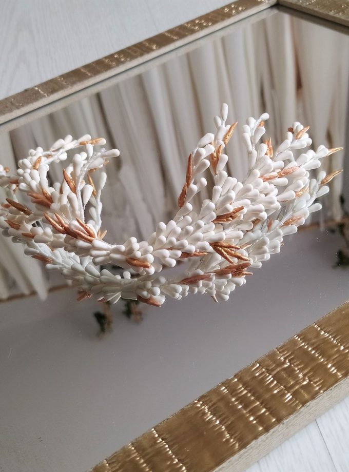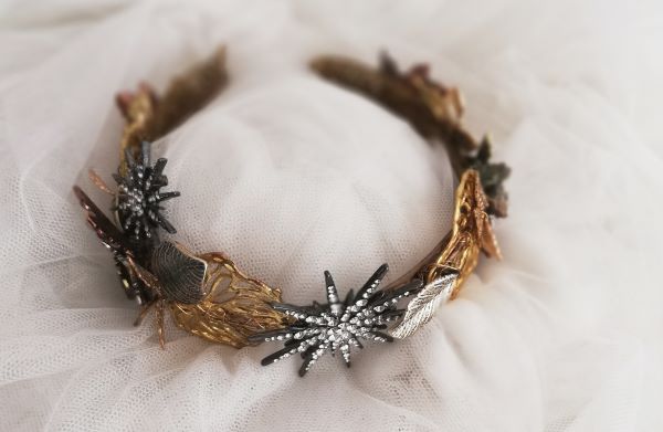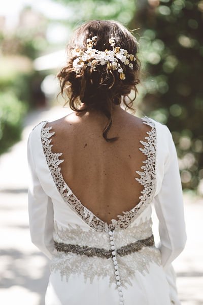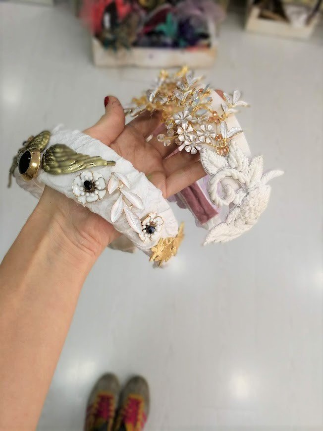 Peinas para colocar con el velo que se comvierten en tocado despúes, tocados para colocar de frente pasada la ceremonia, coronas que se comvierten en tocados… o piezas de color con plumas y flores para darle un toque de color cuando ya estés en plena fiesta