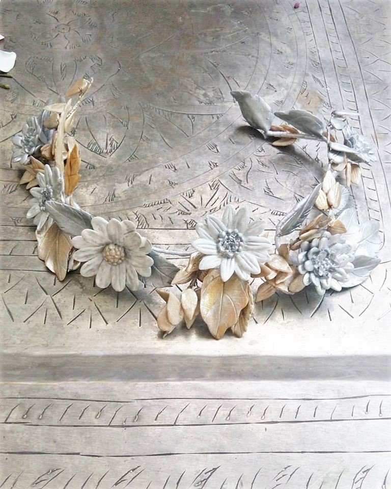 Un tocado con margaritas en tonos plateados combinado con champán para iluminar aún más el estilismo de la novia