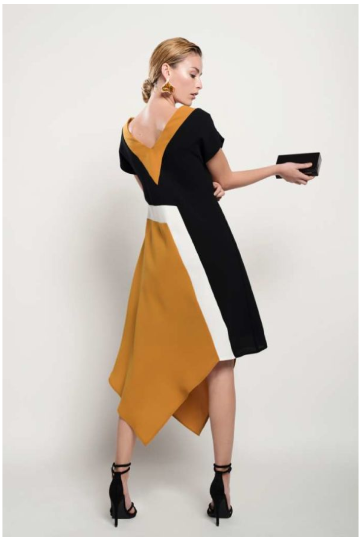 Un precioso vestido asimétrico de Boüret  que juega con el mostazo, el marfil y el negro