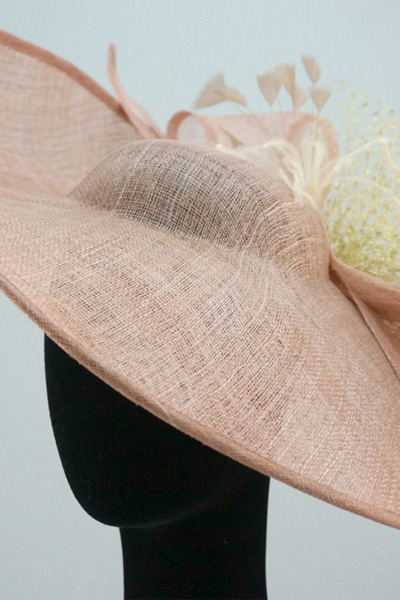 Nuestra pamela ala levantada nude lleva una lazada del mismo tono que la base, un velo dorado y plumas beige y topo.