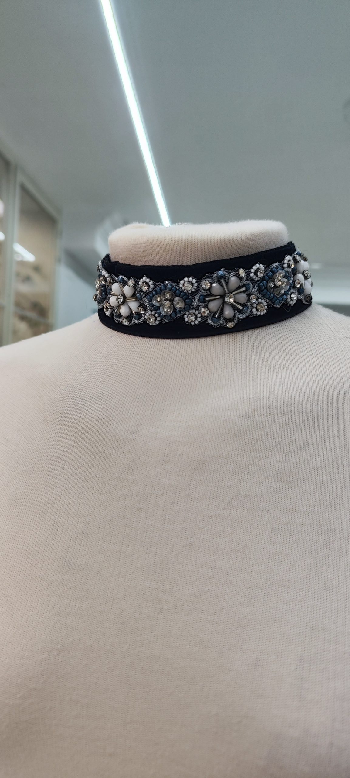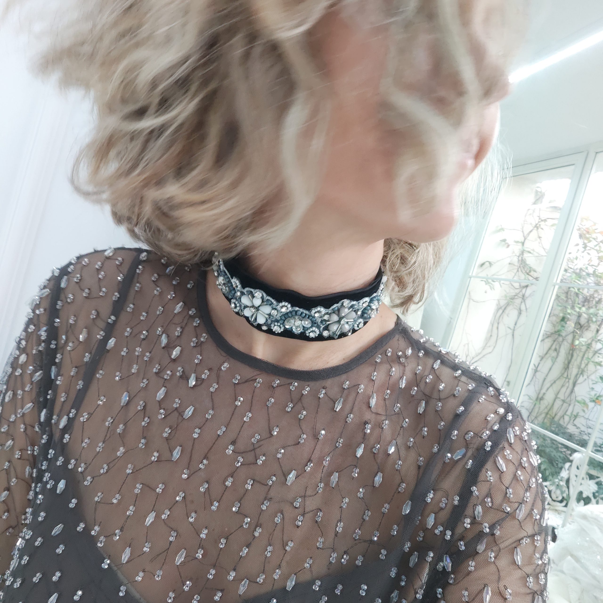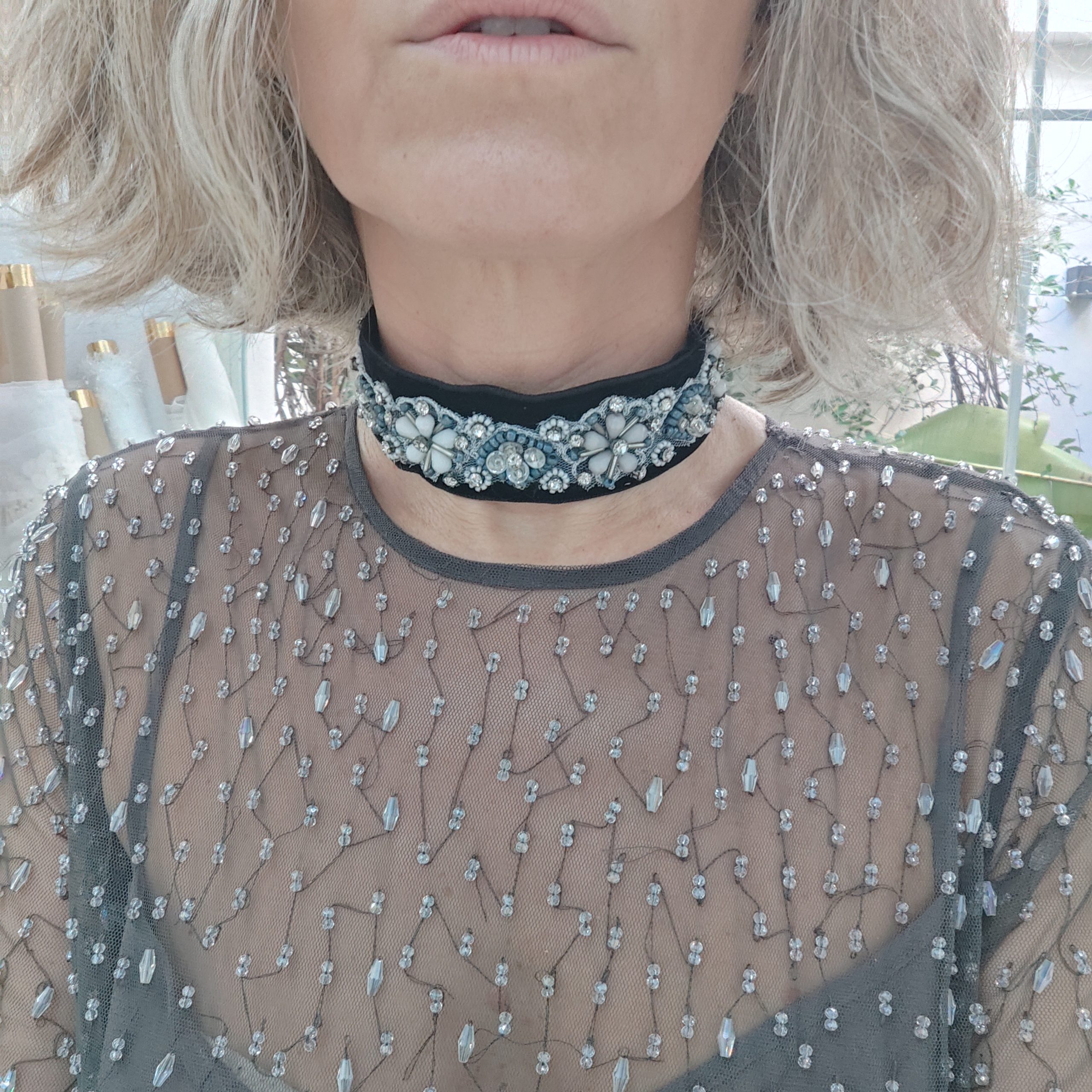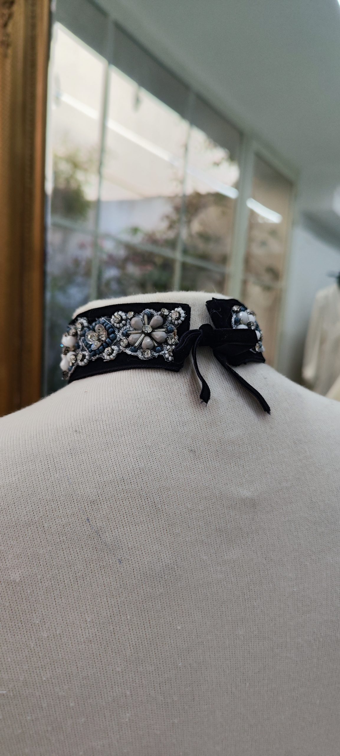 Este choker es una pieza confeccionada de manera artesanal en terciopelo negro a dos caras para sentir el suave roce en la piel. Pedrería espectacular cosida y cierre en lazos de terciopelo para ajustar más fácilmente a cada medida y con opción a poner el lacito hacia delante