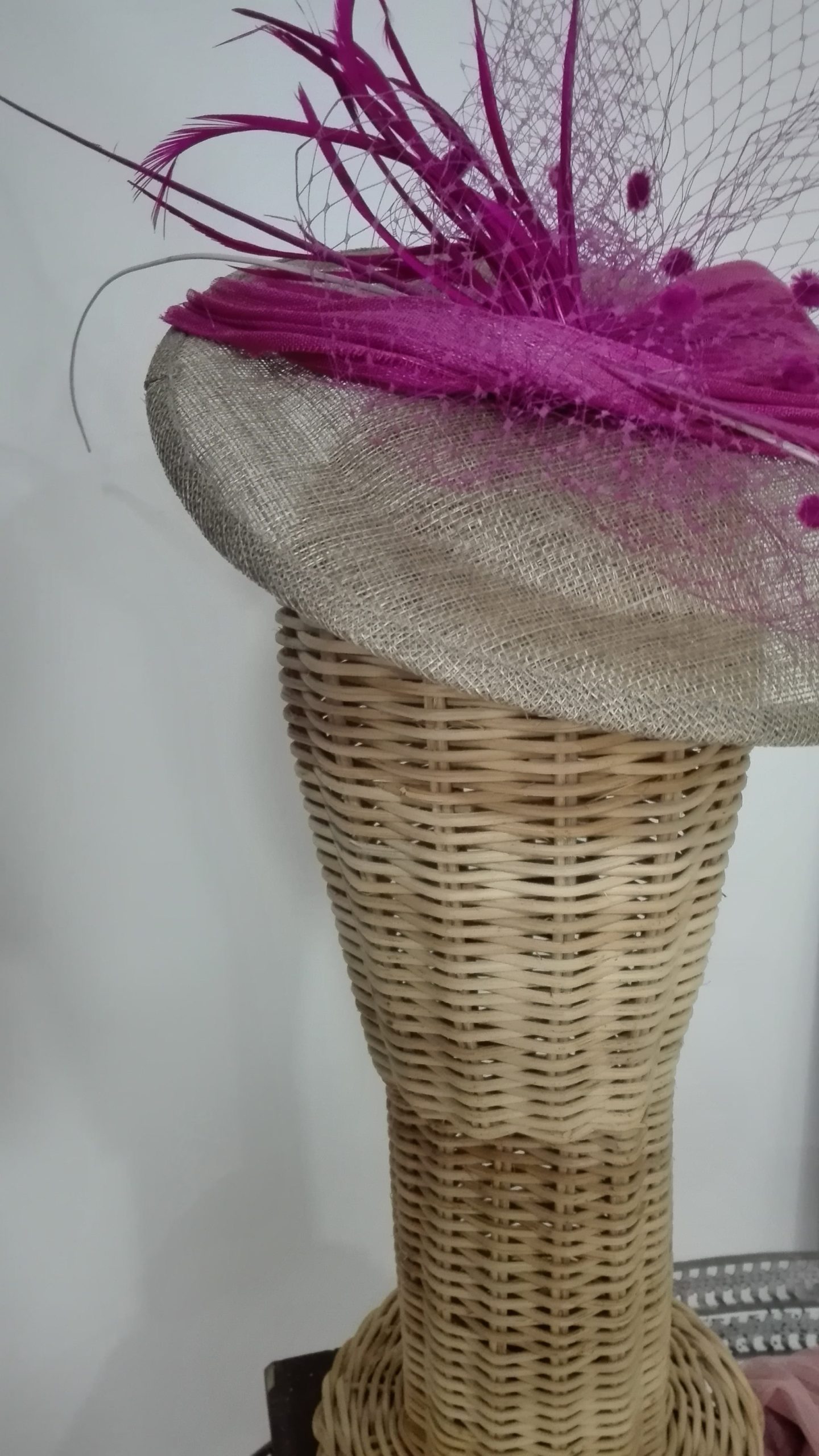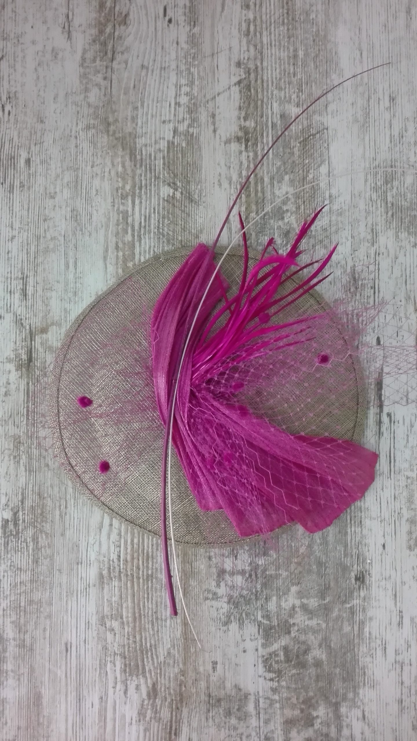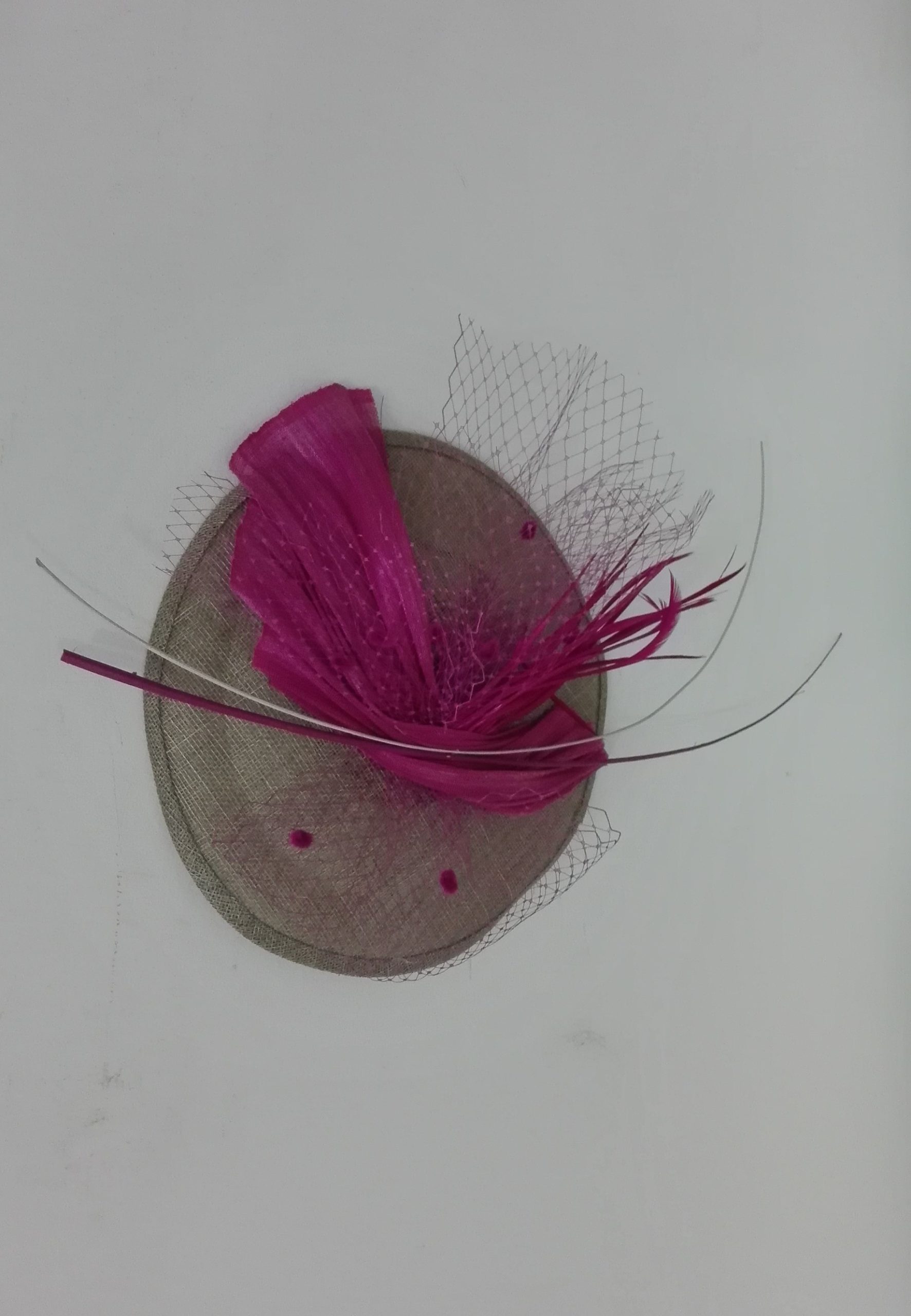 Este precioso tocado Kate con base gris, lazo, plumas y velo buganvilla, y raquis en buganvilla y blanco, es ideal para combinar con tu estilismo de invitada perfecta.